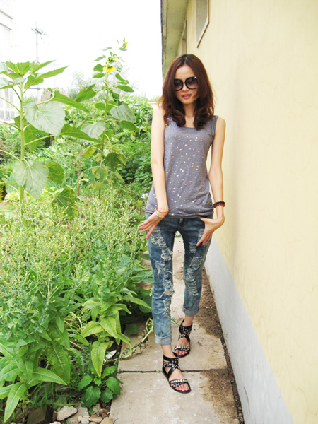 7.露肩斑马T/星星背心+破洞牛仔裤+罗马鞋