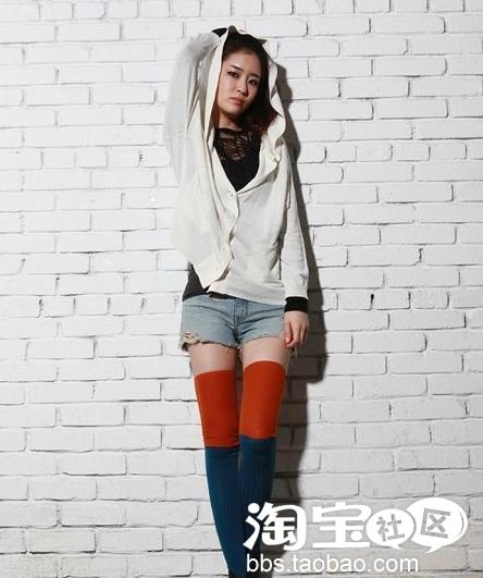 黑色蕾丝T恤+热裤+带帽针织衫+彩色袜