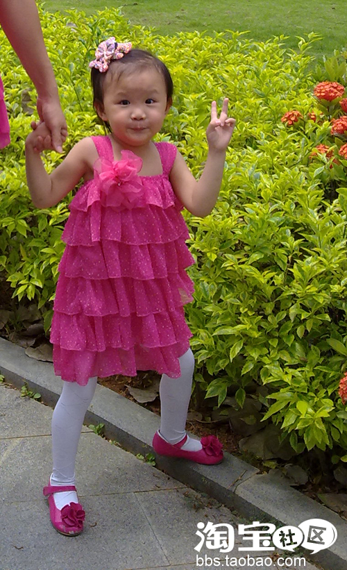 桃红色是女生的最爱,简单款式的连衣裙,亮丽的颜色,配套的鞋子,再加上超级闪闪的小熊头花更好地配合在了一起。
