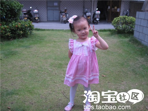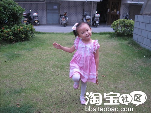 我估计真的是粉红控哦,粉色连衣裙上搭配白色褶皱蕾丝蝴蝶结,恰到好处,还有两用的粉红蝴蝶结头花