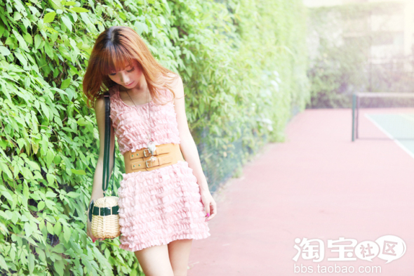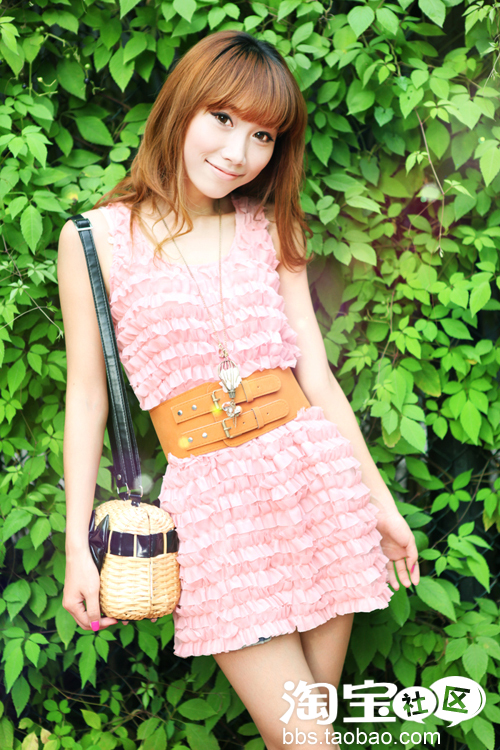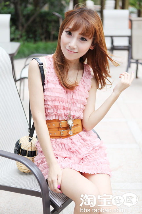 1,粉色雪纺层层op+黄色麂皮腰封+高跟鞋