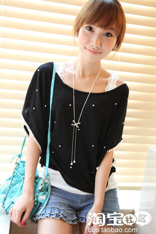 5,斗篷式珍珠针织衫+花边牛仔短裤+人字拖