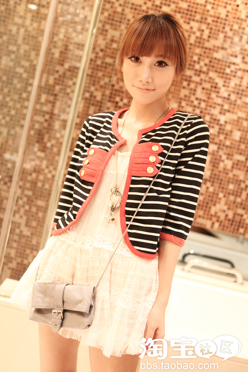 4,条纹海军风味棉质外套+蕾丝裙+高跟鞋
