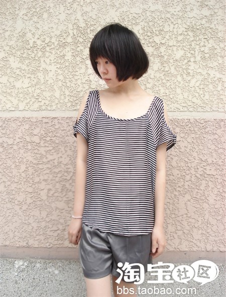 欧风3 黑白条纹露肩绸缎遮肉罩衫~!