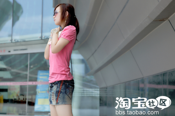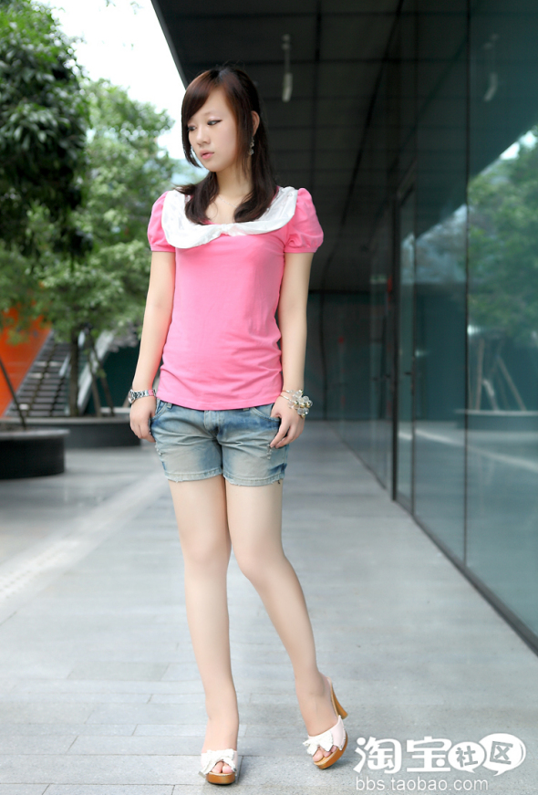 1.粉粉t+牛仔热裤+粉色高跟鞋