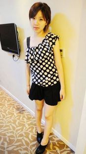 波点依旧大热,最喜欢肩部的设计,宽宽的肩带把另一边的荷叶袖衬的很和谐。