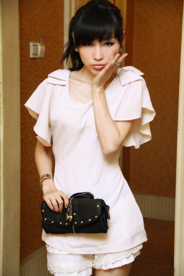 5,双肩蝴蝶结的雪纺长衬衣配蕾丝短裙裤挺清秀的
