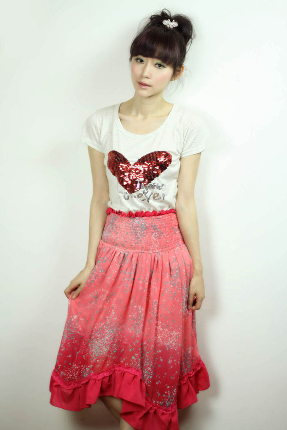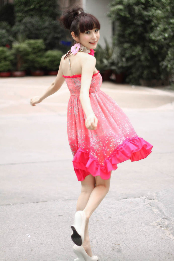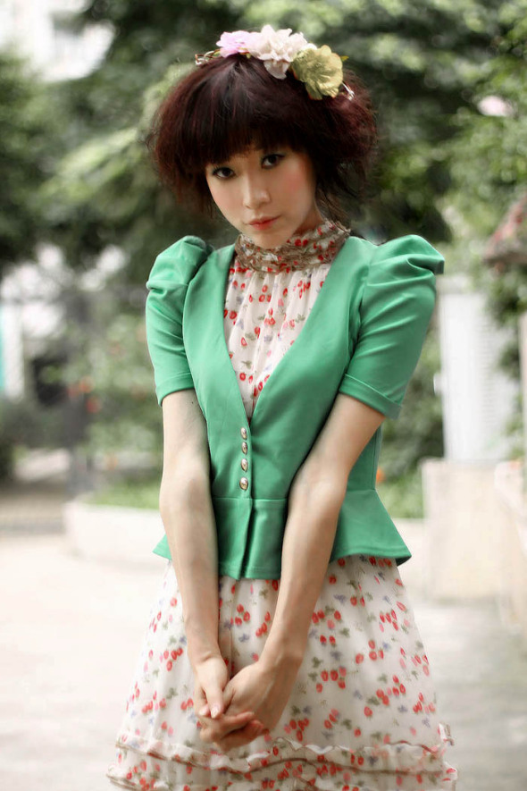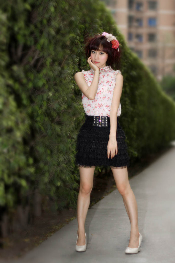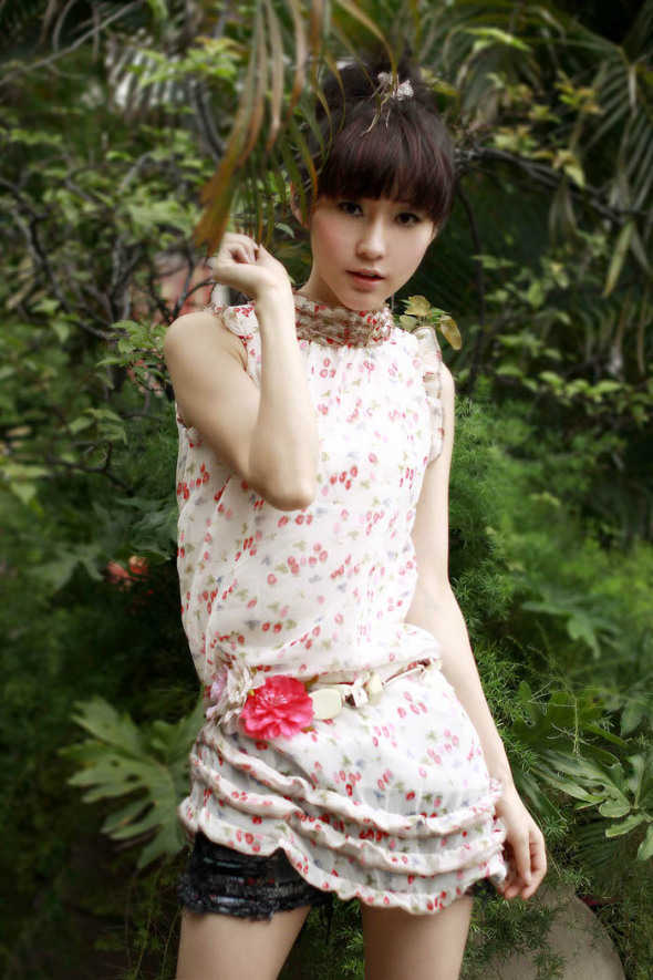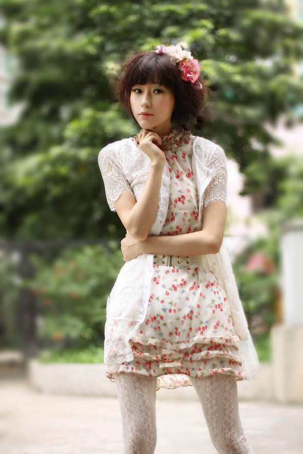 洋娃娃一样可爱的雪纺裙,没有一种风格苏菲不敢尝试哦!为配合樱桃裙苏菲特意化了一个“樱桃妆”,可惜这里看不明显呢,重点在嘴唇,浅色打底由里向外在嘴唇中心轻轻“蹭上”一抹红晕,不用全唇涂,更娇俏的呢!