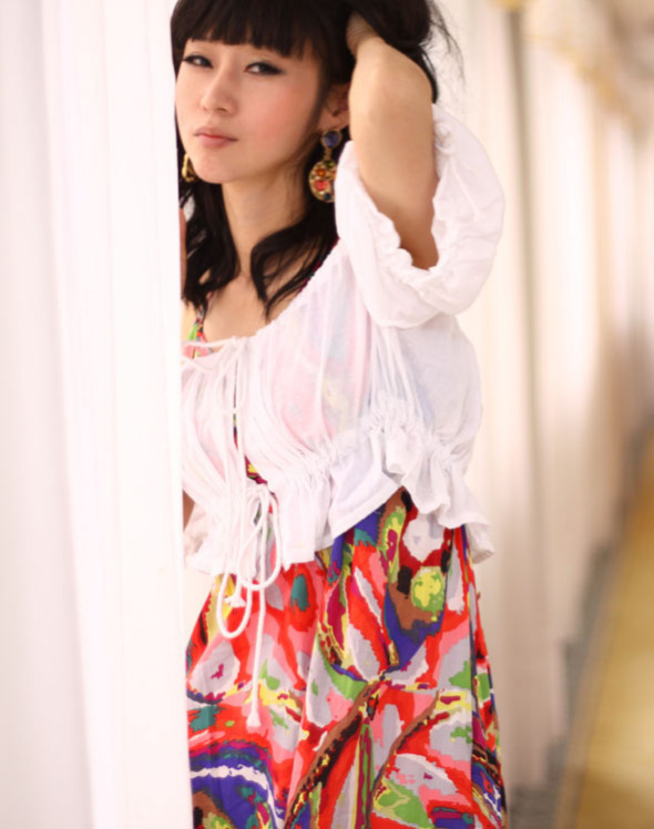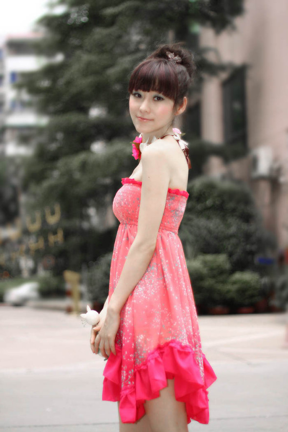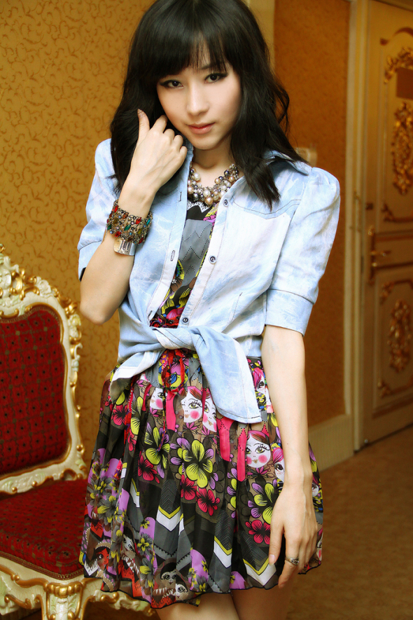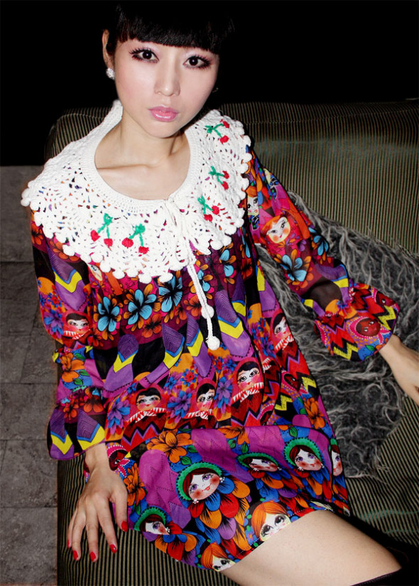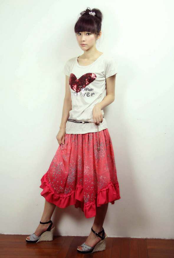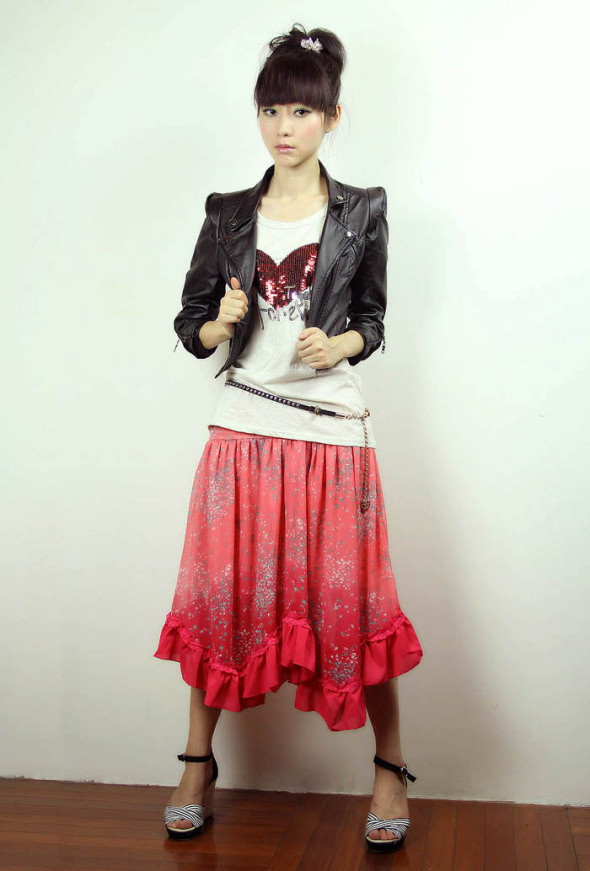 洋娃娃一样可爱的雪纺裙,没有一种风格苏菲不敢尝试哦!为配合樱桃裙苏菲特意化了一个“樱桃妆”,可惜这里看不明显呢,重点在嘴唇,浅色打底由里向外在嘴唇中心轻轻“蹭上”一抹红晕,不用全唇涂,更娇俏的呢!