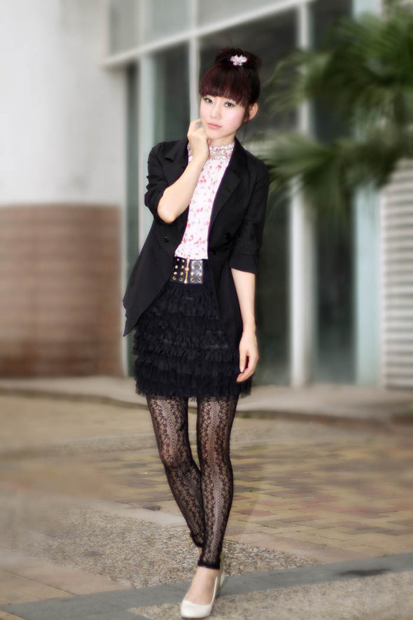 黑色蕾丝拼雪纺蛋糕裙+黑色收腰长款西装+黑色蕾丝袜+黑色蕾丝腰带