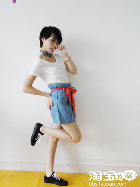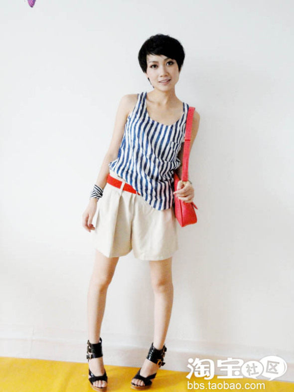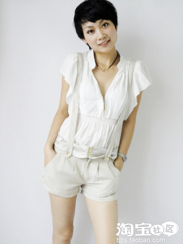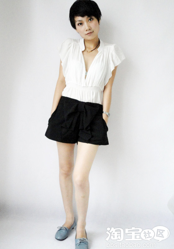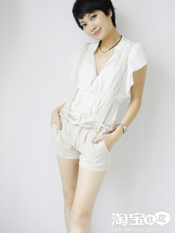 深色系的上衣配浅色系的短裤,短裤腰间的色彩过度,使身上整个色彩很协调
