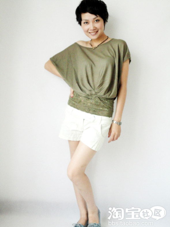 军绿色的宽松针织杉,蝙蝠袖的,很薄,所以很秀气