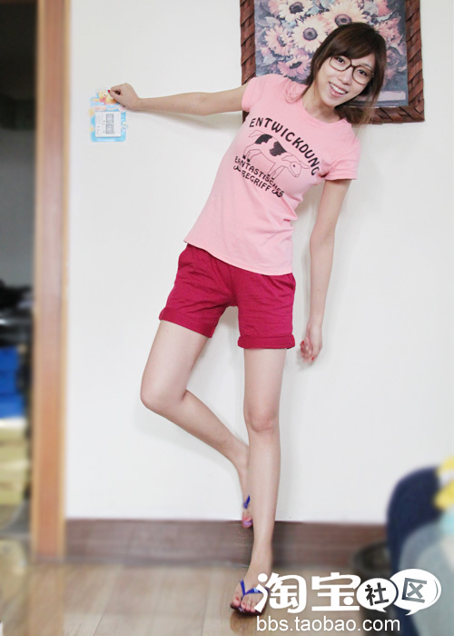 大黄先把短裤边挽起来 上面搭了一个T看起来很粉嫩 整体颜色很明快