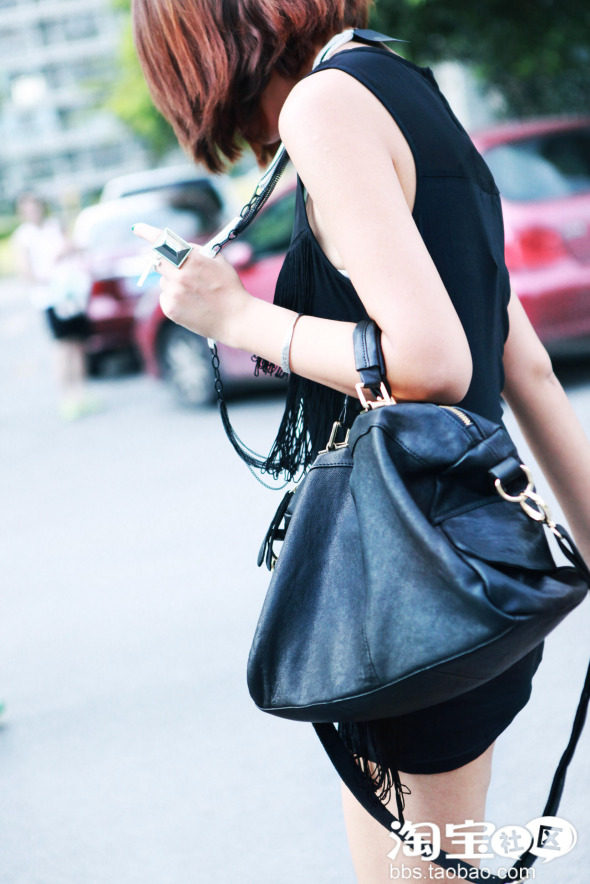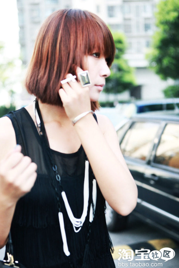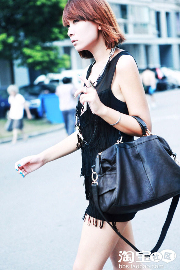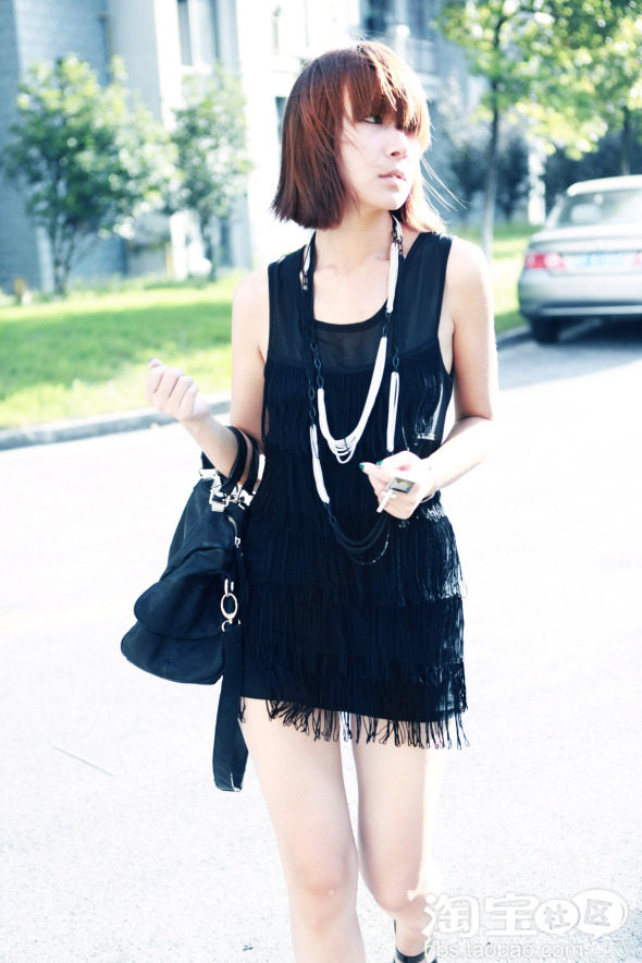 第三款是模特姑娘很喜欢的细条流苏背心,流苏细密繁复的细节很赞!其实也可以作为超短连身裙了,一般我会在下面搭配哈伦裤,热裤之类的,单独穿其实更有感觉!由于是纯黑色的衣服,有大块的面积可以让mm们搭配饰品,戒指什么的也不能忘!