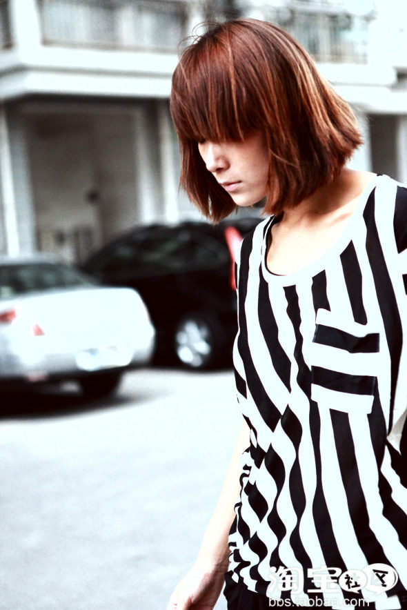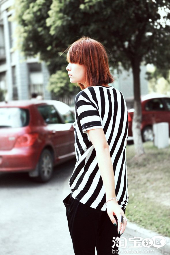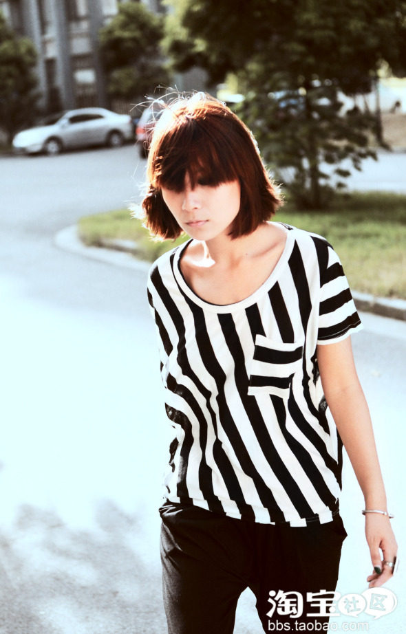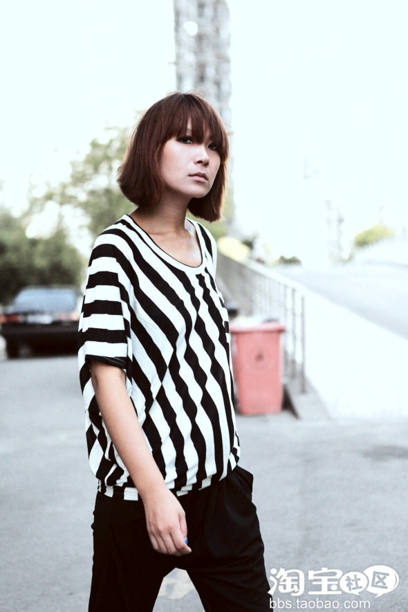 第二款,是永远不过时的黑白条纹tee,这件是左右不对称的斜条纹款式,有悬垂的质感,搭配裙装和仔裤都会很有型。