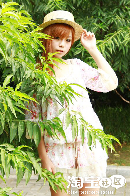 碎花缩口上衣+蓬蓬裙+可爱草帽