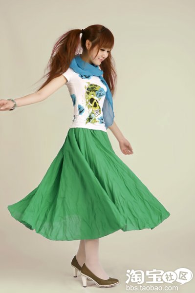 棉质的大摆裙随意搭配一件T恤,很有校园的风格.
