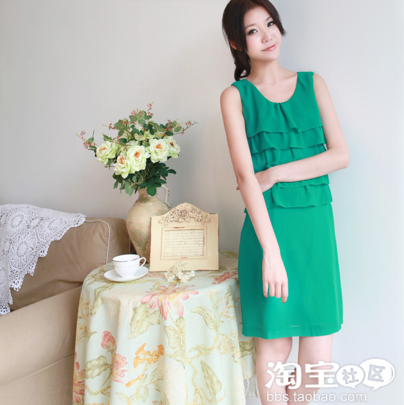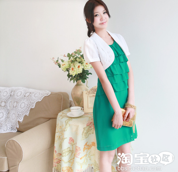 一件绿松石般优雅裙子,胸前层层涟漪的荷叶边,好似湖面的波纹,唯美叫人神往