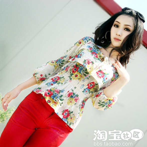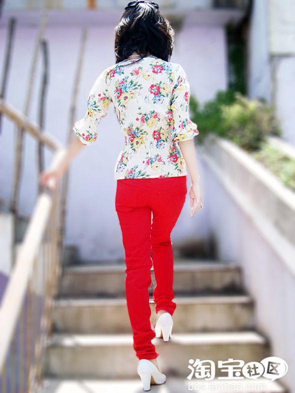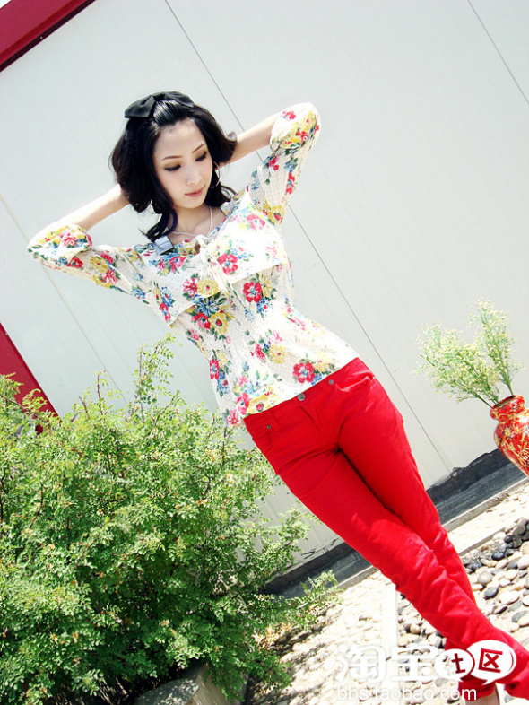 花衬衫+红色休闲裤+小白鞋+粉玫瑰戒指+蝴蝶结头花