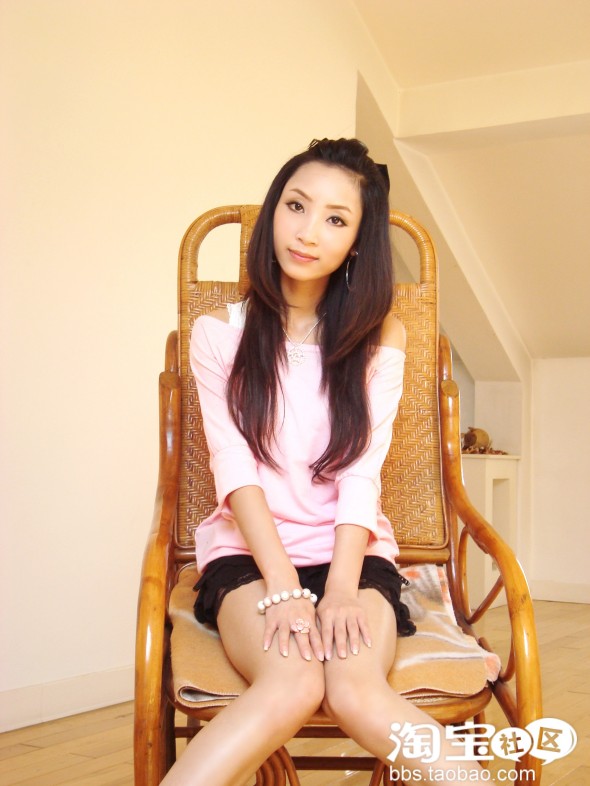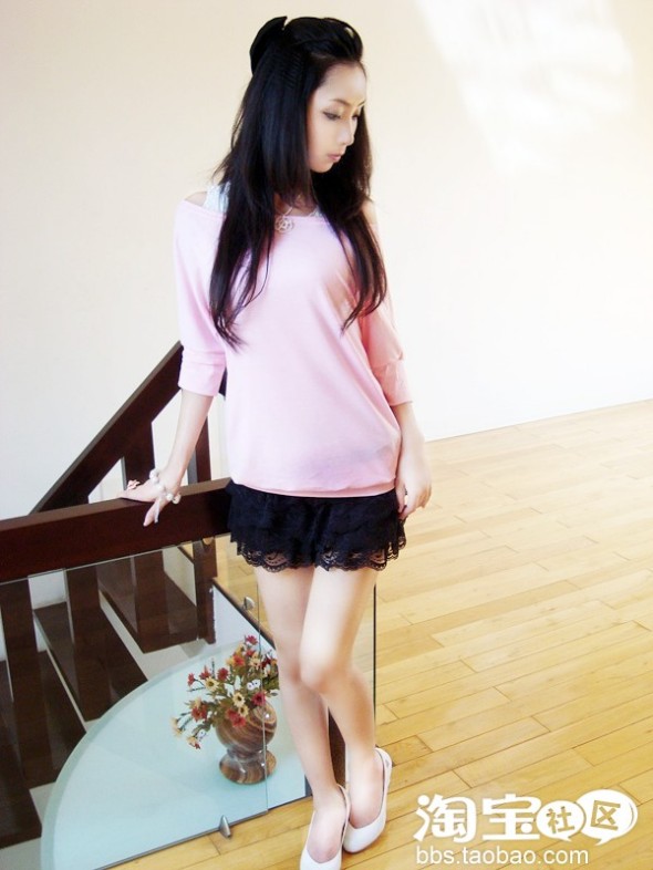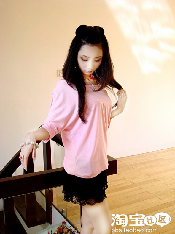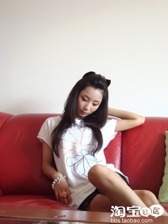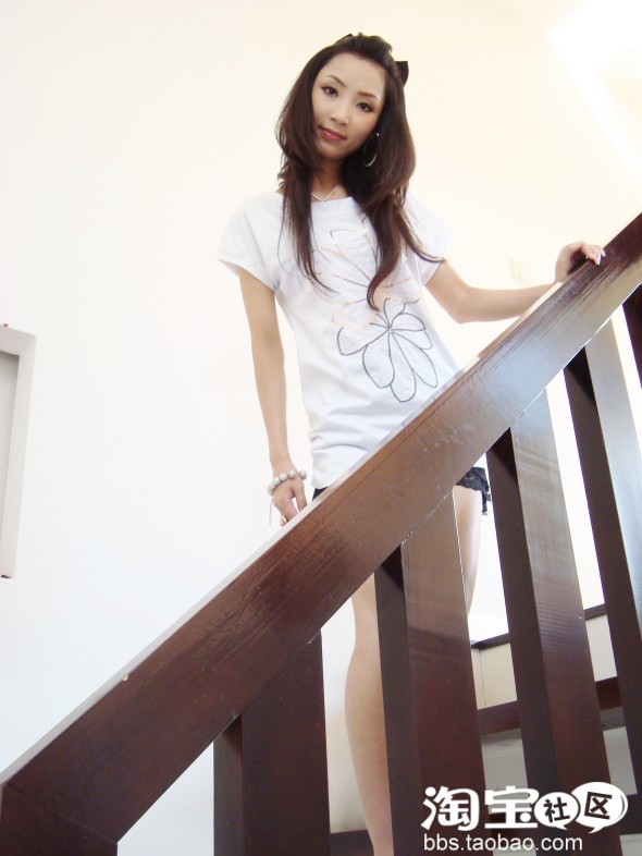 5.白色亮片花短袖T恤+性感小裤裙+珍珠手链+粉玫瑰戒指+大蝴蝶结头花。我的楼梯居家照