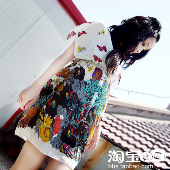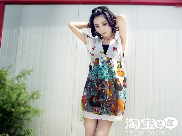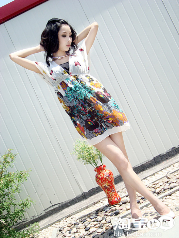 大花雪纺连衣裙+小白鞋+珠珠项链+蝴蝶结头花。我的平台居家照