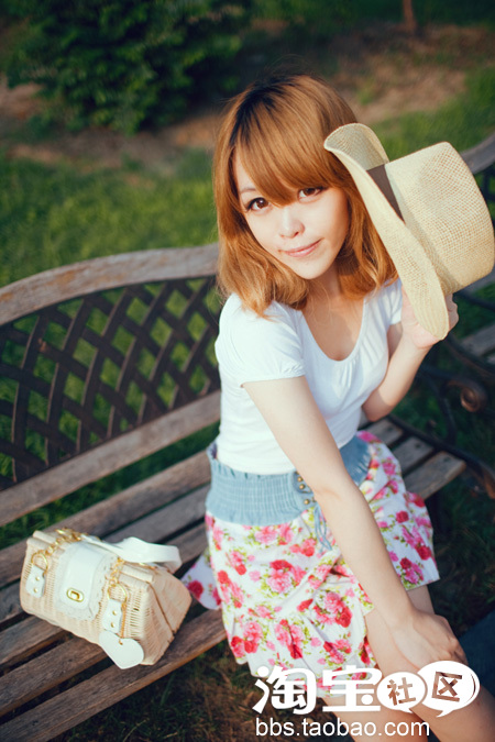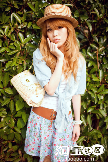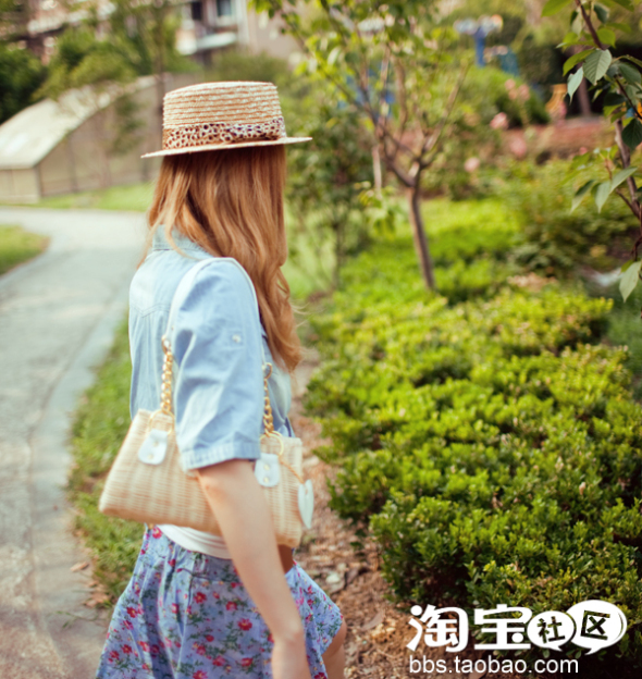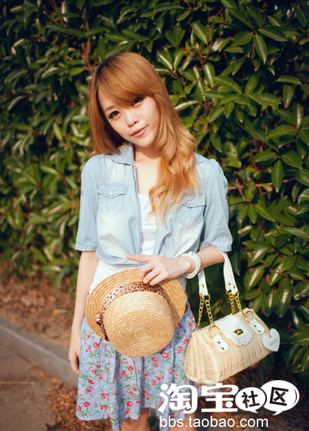平顶草帽,牛仔绑带开衫,白色打底tee,牛仔碎花短裙和藤编包包