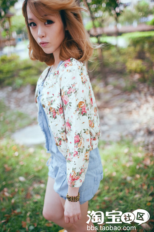 玫瑰印花外套,牛仔连体裤,长款的链条手链