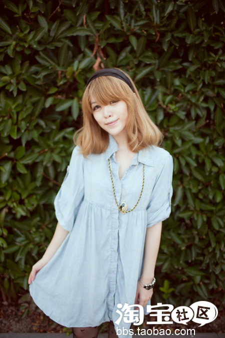 黑色丝袜+蓝色水洗牛仔洋装+黑色发箍~