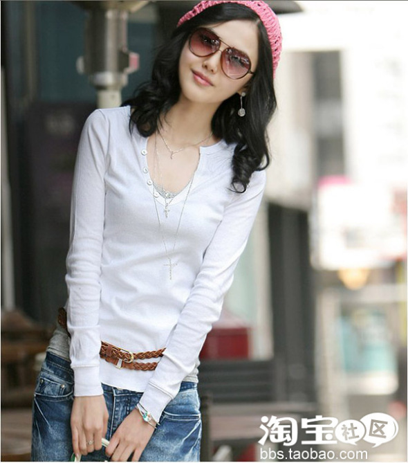 其实肩宽并不是坏处,反而是好处。那样更能把衣服的型都衬出来。肩宽的适合穿V领的T,如果你想穿圆领的可以搭配点装饰项链,就打个比方我店里的这件衣,这种类型的你穿估计合适。