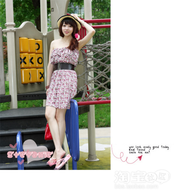 5.花色裹胸连衣裙+棕色皮腰封+人字拖