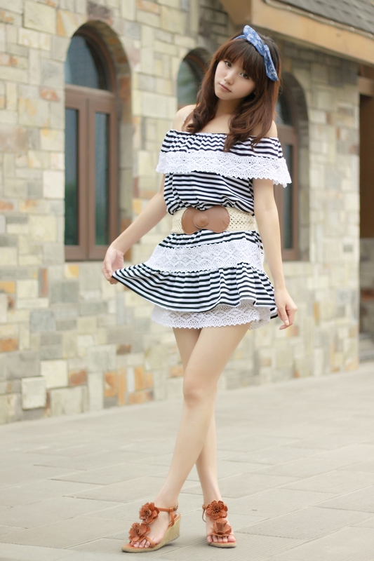 8、VIVI今年夏季秀出的一款连衣裙,条纹与蕾丝给人一种很唯美的感觉,作为一字领穿着更具女人味,秀出漂亮的肩线与锁骨,更为迷人。