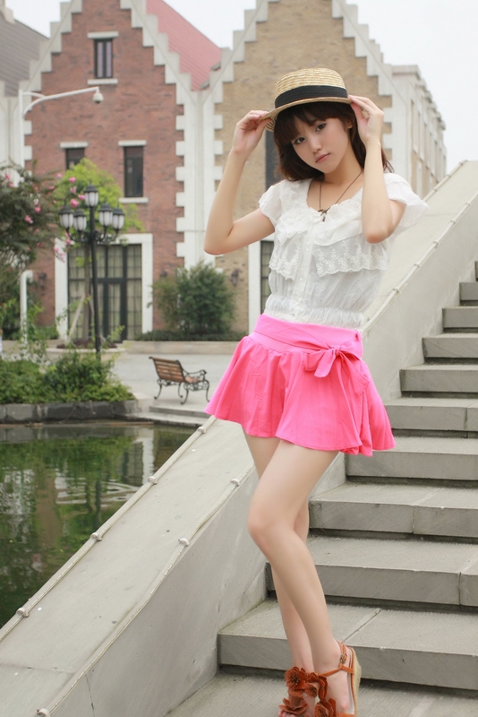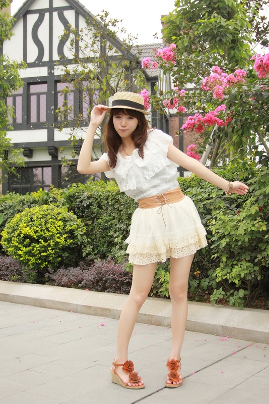 5、简约的白色衬衫加上层层蕾丝印花,大气中露出几分可爱,搭配多层鹿皮绒腰封系带杏色日本蕾丝短裙,让他觉得你精心的打扮很得体。