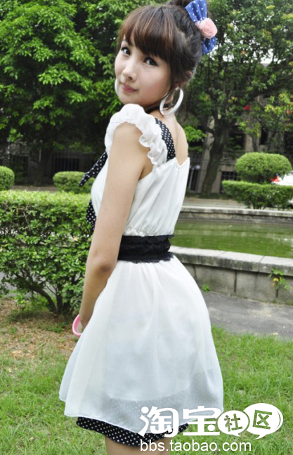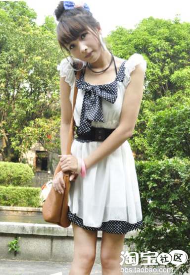 晶莹透白的雪纺裙,飘逸仙美,让我不由得想翩翩起舞,白色,是不是在夏天看起来特凉爽,很轻巧呢。盘起头发,带上最爱的蝴蝶结,我又变成白雪公主了,是不是。