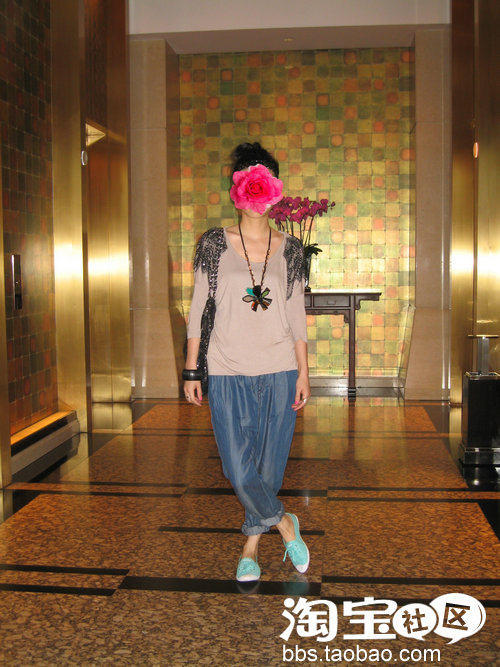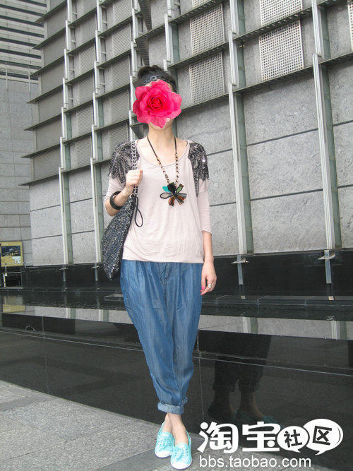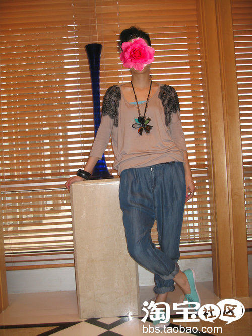 下面配一条较宽松的蓝色牛仔裤,