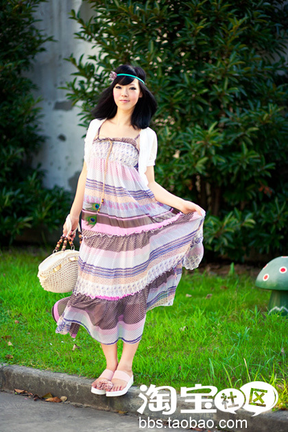 长裙可搭配白色小衫,平底凉拖,民族发箍,这些都能为整体增色不少哦。:)