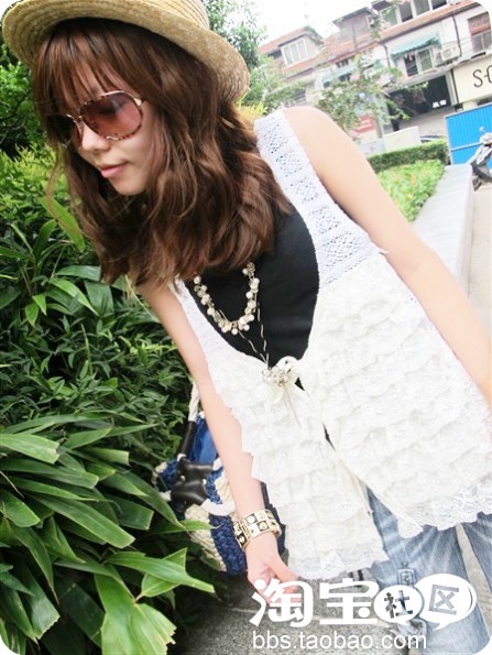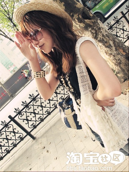 平底草帽+豹纹墨镜+蕾丝层层镂空马甲