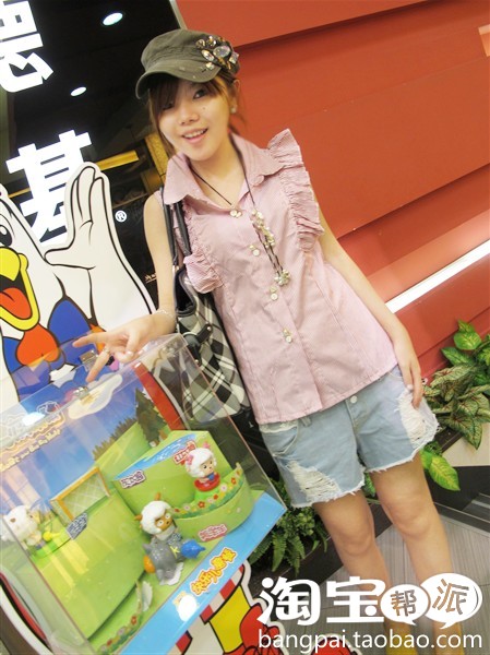 .显瘦波点荷叶衫+蕾丝破洞双排牛仔短裤