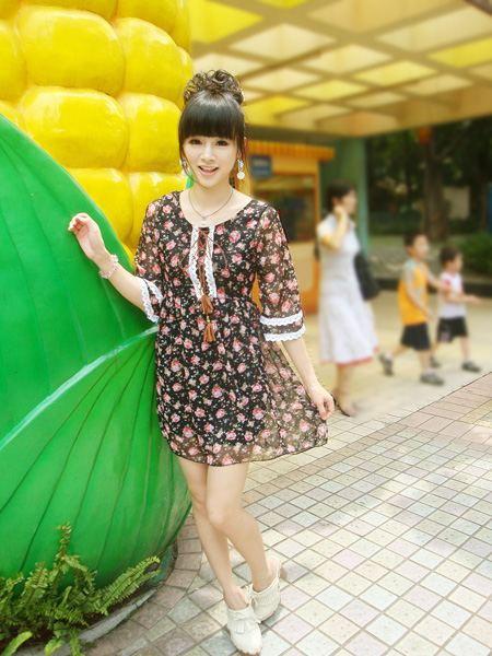 小室喜欢有特色的YY,特别是民族风的,上身的感觉就很不错哦。这款带点小小民族风情的碎花裙,展现女生可爱,调皮的一面哦。