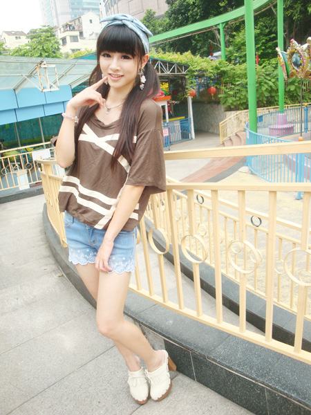 (四)宽松短款上衣+刺绣花边牛仔短裤+牛仔发带
