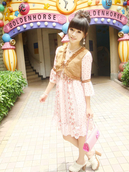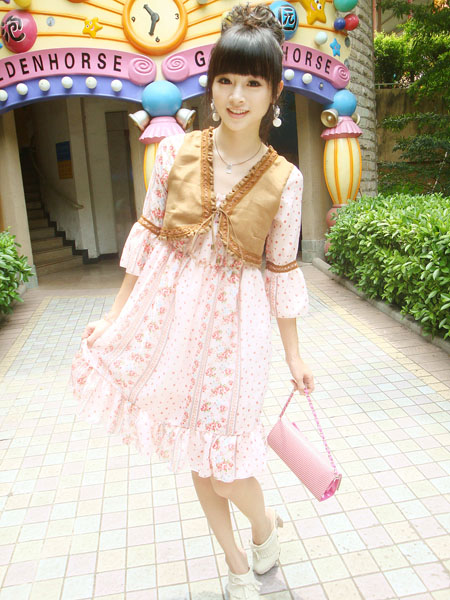 粉色碎花衬托出恋爱的心情,更显粉嫩肤色。加上仿廘皮马甲的装饰,多了一份贵气哦