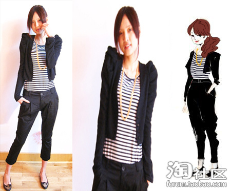 (搭配要点:黑色耸肩针织衫,条纹T 休闲卷边裤和平底鞋