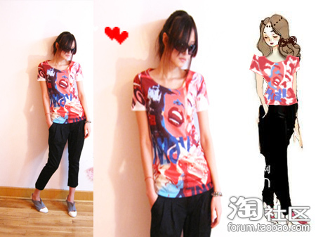 (搭配要点:复古风的印染T恤,搭配卷边休闲裤 时尚又OL