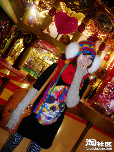 15.狐狸毛耳罩+彩色针织帽+骷髅T+字母打底裤=圣诞约会装