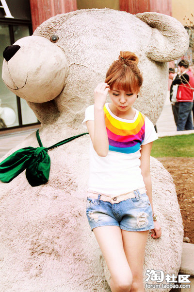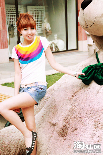 10.彩虹纯棉T+磨边短裤=清纯的造型 给人小巧清爽的感觉 非常适合约会和去游乐场 给人轻松的感觉