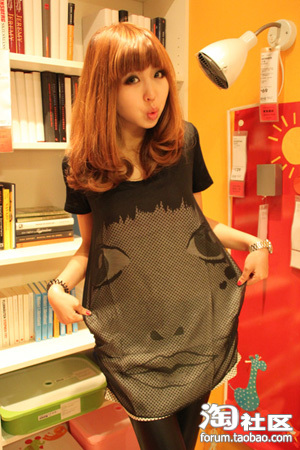 4.黑色大眼睛双层纱T恤式连衣裙+皮裤=简单又不失个性