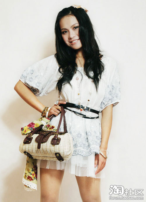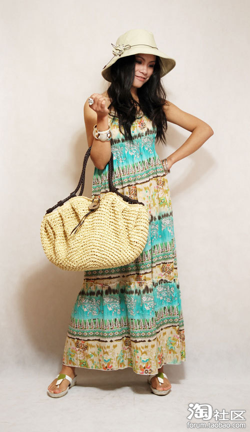 有些小折的半身裙上面洒满了白色的小花瓣,恰到好处的V形领口是不是专门为喜欢饰品的你准备的呢,一串珍珠项连,一个大大的香奈儿款的手镯,再拿上一个藤编手袋,这一切都是自然的感觉,当然忘不了一顶与裙子相呼应的遮阳帽。