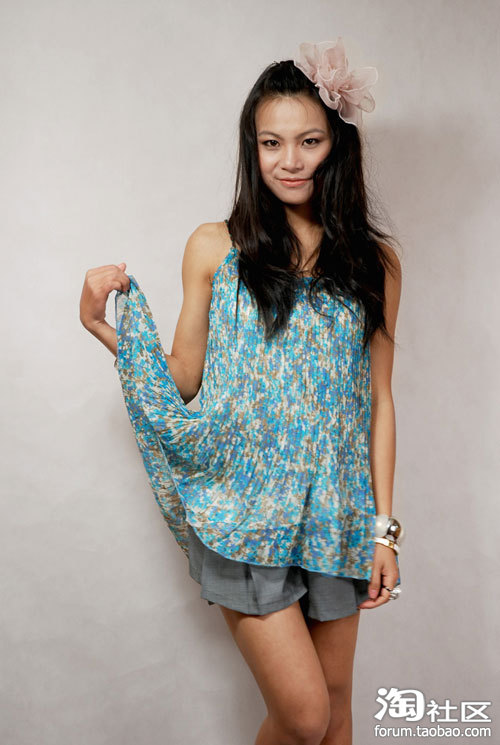 花儿永远是春天的主题,因为有了花儿,世界才得以丰富它的颜色。春天总是有它柔软而浪漫的心情。何不给心情不错的自己美美的戴上一朵大大的花儿呢。淡蓝的冷色是悦目的,中间点点褐色的小碎花更是让这件雪纺衫有了许多的温暖,看上去很舒服。简单的小裤裙更好的衬出这件出去郊游必备的吊带雪纺衫