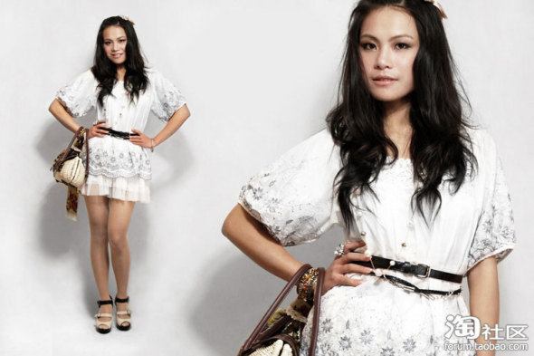 白色一直是我比较喜欢的色,也许就是因为它没有颜色,才更加显的自然与优雅。而白色和蓝色更是大自然完美的配色,如同蓝天与白云,就是那么的和谐。带点泡泡绣的白色上衣,在领口处田园编织设计,再配以简单自然的蓝色的手工刺绣便形成了这件上衣在春天最好的时光里最恰当的出现。我喜欢。加上一条简单的蕾丝小裙,配上一条细细的黑色腰带,不仅起到了点缀的作用,更是把腰线拉高,更好的来修饰身材。
