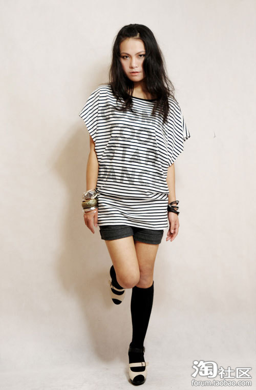 又是一件大T横条的海魂衫元素在剪裁上又不失时尚的感觉简单的T恤是展示饰品最好的搭配了