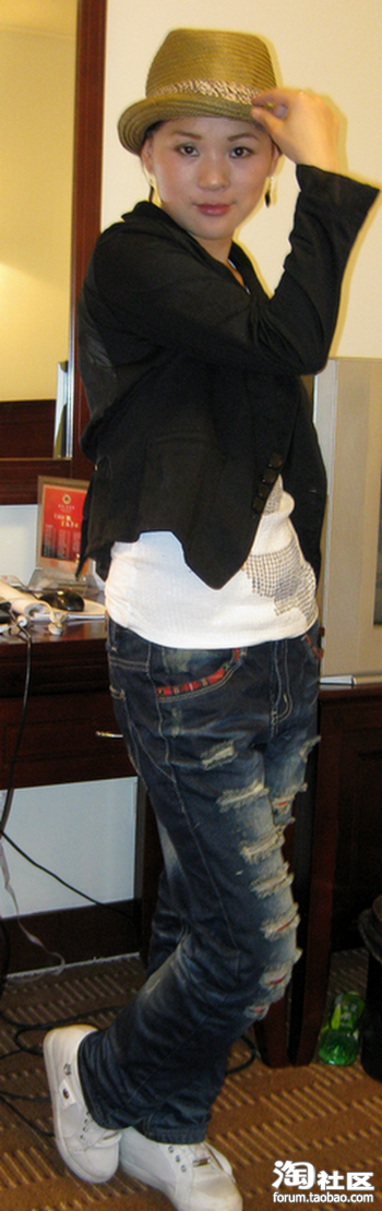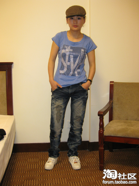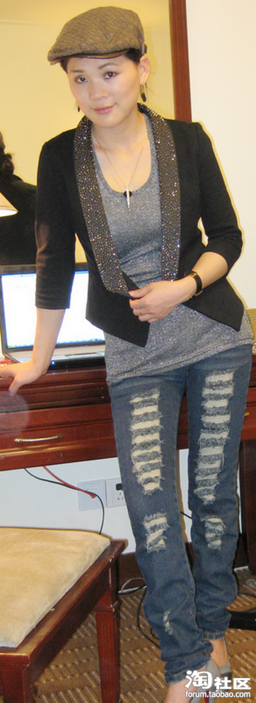 不同的是牛仔裤多了很多伤痕